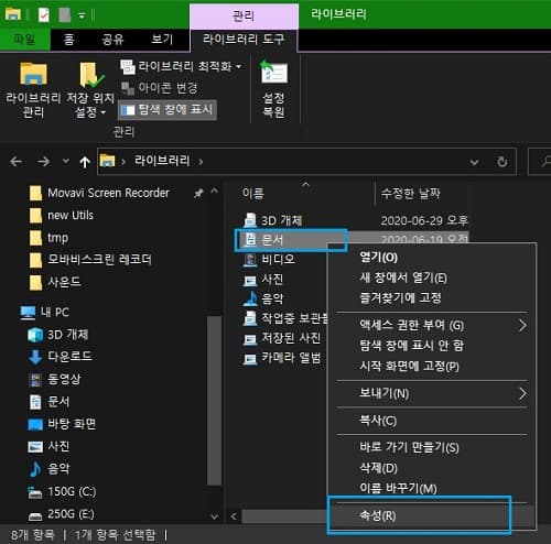 하나의 드라이브와 같이 의미 없이 포함되어 있는 라이브러리 항목은 우클릭하여 삭제하면 됩니다. 그런데 하나의 라이브러리에 두 개의 폴더가 연결된 경우에는 일일이 삭제해야 합니다. 라이브러리 항목들이 열린 창에서 우클릭한 후 속성으로 들어갑니다.