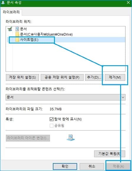 속성에서 없애고자 하는 폴더를 제거 버튼을 누른 뒤 적용을 누르면 됩니다.