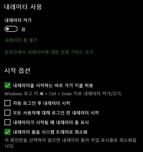 만약 시작 옵션 중 자동 로그인 후 내레이터 시작에 체크가 되어 있다면 윈도우 시작과 동시에 내레이터가 기능하므로 사용하지 않을 경우에는 이 항목의 체크 표시는 꺼두어야 합니다.