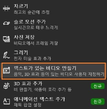 4. 사진 앱 우측 상단의 편집 및 만들기 메뉴 선택 후 텍스트가 있는 비디오 만들기 클릭