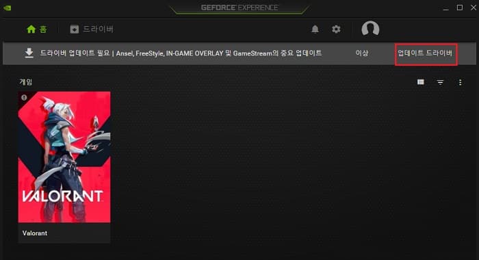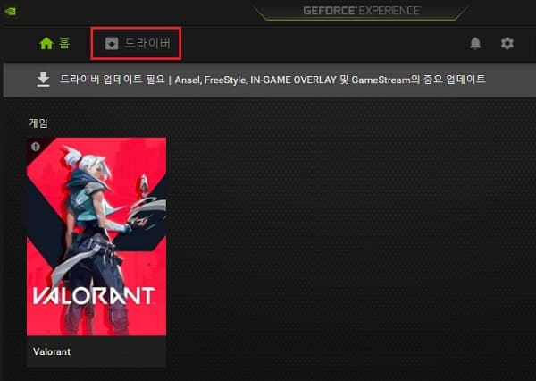 지포스 익스피리언스가 이미 시스템에 설치 되어 있는 경우에는 익스피리언스를 실행한 후 좌측 상단의 드라이버 버튼을 눌러 줍니다.