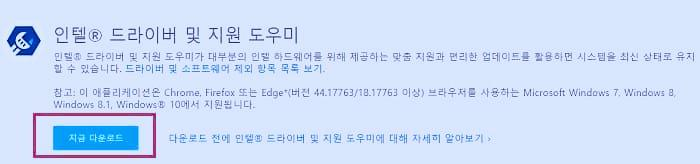 지포스 계열이 아닌 인텔칩셋 계열의 그래픽 칩셋일 경우에는 인텔 드라이버 지원 도우미를 이용하여 드라이버 업데이트를 시도합니다. 아래의 링크를 클릭하여 해당 페이지로 이동합니다.