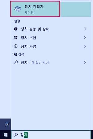 윈도우즈 작업표시줄의 검색창에 장치 관리자라고 타이핑한 후 장치 관리자를 클릭하여 실행시킵니다.