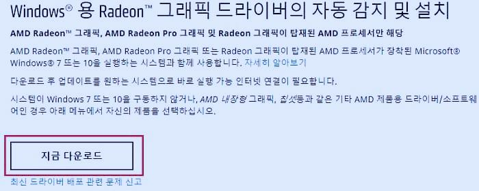 위의 사례에서와 마찬가지로 아래의 링크를 클릭하여 AMD 드라이버 지원 페이지로 이동한 후 좌측 하단의 지금 다운로드 버튼을 클릭한 후 설치합니다.