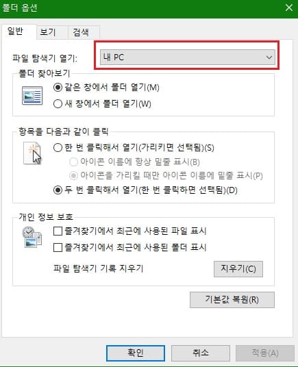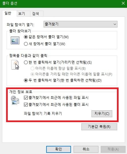 위의 이미지에서 처럼 개인 정보 보호 섹션에서 즐겨찾기에서 최근에 사용된 파일 표시, 즐겨찾기에서 최근에 사용된 폴더 표시의 체크를 해제하면 최근에 사용된 파일, 폴더 모두 더 이상 표시되지 않게 됩니다. 일시적으로 최근에 사용한 내역만 지우고자 할 경우에는 지우기를 클릭하면 됩니다.