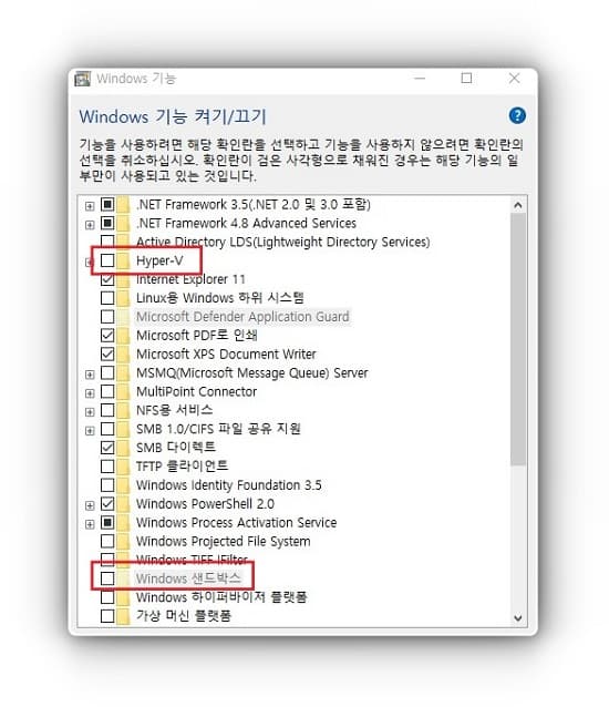 3. Windows 기능 창에서 Hyper-V, Windows 샌드박스 기능 체크 해제하기