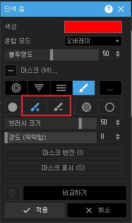 마스크 브러시에서 플러스 브러시는 원하는 부위만 색상을 덧칠할 때 사용하며, 마이너스 브러시는 덧칠해진 색상의 일부분을 지울 때 사용됩니다. 즉, 플러스 브러시를 이용해 원하는 부위에 원하는 색상을 원하는 만큼의 불투명도로 덧칠한 다음 마이너스 브러시를 이용하여 마지막 다듬는 작업을 하게 됩니다.