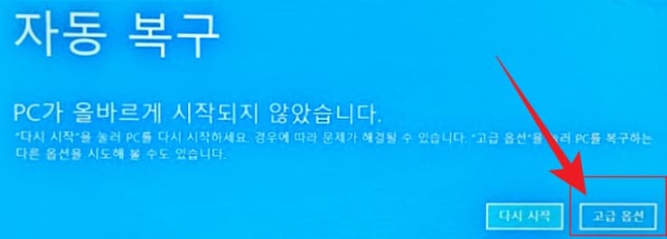 자동 복구 화면에 진입이 되면 우측의 고급 버튼을 누릅니다.