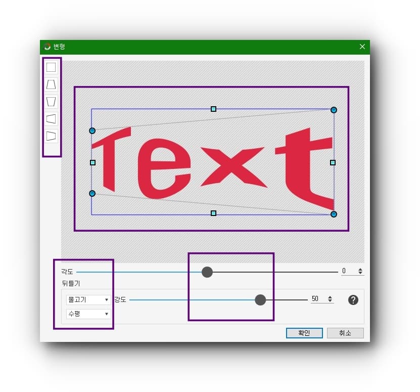 상세 편집창에서는 삽입 객체의 외형에 다양한 변형을 가할 수 있는 도구들이 있습니다. 좌측의 직접 변형틀, 아래쪽에 있는 뒤틀기 툴, 편집 보드에서의 객체 꼭짓점을 이동시켜 가하는 직접적인 수동 변형, 하단의 슬라이드 바를 드래그하여 가하는 변형 등 다양한 변형 도구들이 있습니다.