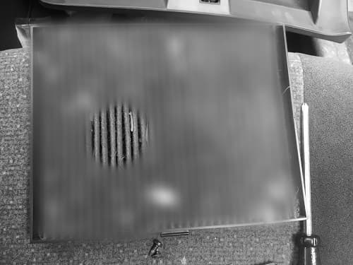 - 글로브 박스가 반 탈거된 상태에서 안쪽 전면을 보면 에어컨 필터가 차량 진동 등으로 밀려 나오지 않도록 하는 쇠로 된 가드가 보입니다. 가드의 위아래 나사 두 개를 풀러 준 뒤 가드를 빼냅니다.