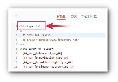 아래의 이미지는 티스토리 html 편집의 첫줄에 존재하는 html5 문서임을 선언하는 부분을 보여주고 있습니다.