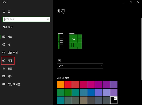 개인 설정을 누르면 윈도우즈 설정창이 뜨는 데, 왼쪽의 항목에서 테마를 눌러 줍니다.