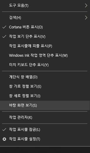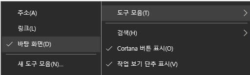 해당 기능을 사용하고 싶지 않아 제거하고 싶을 경우에는 다시 작업표시줄을 우클릭한 다음 도구 모음에서 바탕 화면의 체크 표시를 한번 더 클릭하여 제거하면 작업 표시줄에서도 사라지게 됩니다.