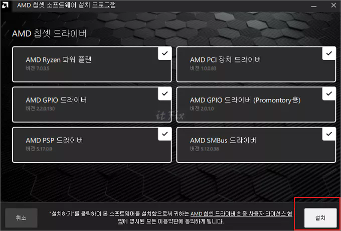 다운로드가 끝나면 프로그램이 자동으로 업데이트된 칩셋이 있는지 시스템을 검사한 후 해당 PC에서 설치할 수 있는 업데이트된 드라이버 목록을 보여줍니다. 설치를 눌러 GPU 드라이버 업데이트를 포함한 칩셋 업데이트를 진행합니다.
