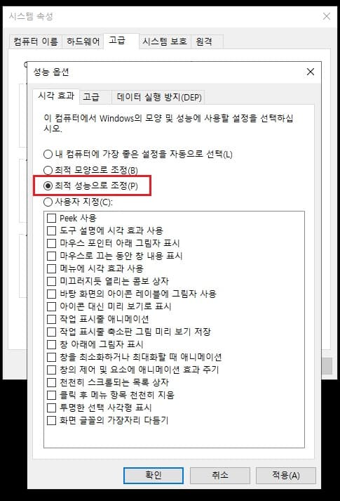 또한 바탕화면의 내 PC를 우클릭한 후 속성의 고급 시스템 설정에서 고급 탭의 성능 항목을 최적 성능으로 조정하여 문제가 해결되는지도 살펴보아야 합니다.