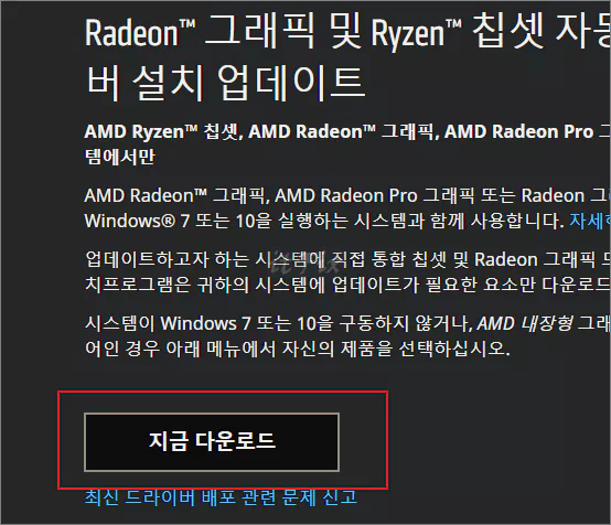 AMD 그래픽 카드를 사용하는 시스템의 경우에는 아래의 링크된 AMD 드라이버 업데이트 도구 다운로드 페이지에서 설치 파일인 라데온 아드레날린을 다운로드한 다음 설치를 진행합니다.