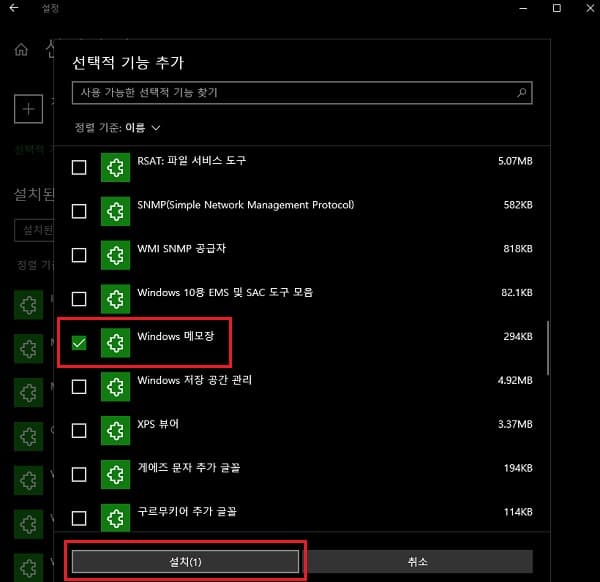 기능 추가를 누르면 추가로 설치 가능한 목록이 나오는 데 스크롤 바를 아래로 내려 Windows 메모장이라는 항목을 찾은 다음 체크한 후 하단의 설치 버튼을 눌러 메모장을 설치해 줍니다.