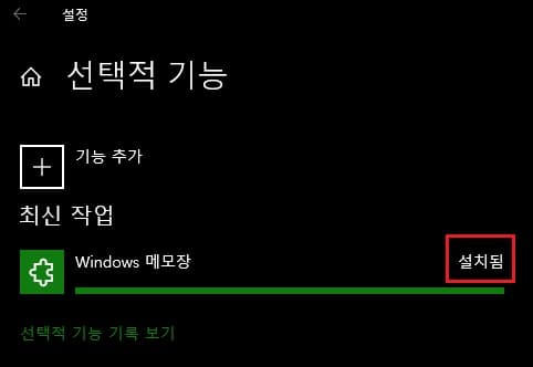 이상 없이 메모장이 설치되었다면 선택적 기능 항목의 최신 작업 내용에서 메모장이 설치됨이라는 화면을 보실 수 있습니다.
