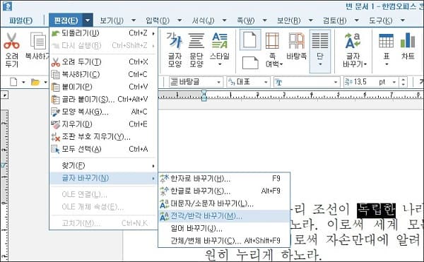 - 편집 > 글자 바꾸기 > 전각/반각 바꾸기를 클릭합니다.