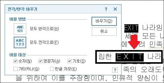 일부 예외적으로 전각이나 반각으로 바꿀 수 없는 한글이나 한자 등은 바꾸기 실행시 원래의 모습 그대로 유지되게 됩니다.