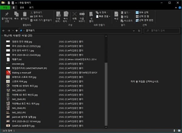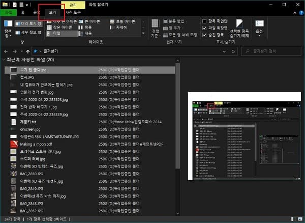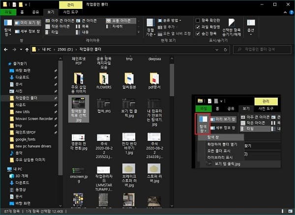 이렇게 할 경우에 이미지 파일들을 탐색기에서 간단하게나마 아이콘 형태가 아닌 실제 이미지의 축소 형태로 가장 우측창에서 확인이 가능합니다. 아래의 이미지는 제가 사용하는 가로 3단 구조의 파일 탐색기 모습입니다.