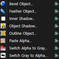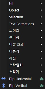 아래의 이미지에서 보는 바와 같이 Fill, Object, Selection, Text Formations, Flip Horizontal, Flip Vertical이라는 6개의 메뉴가 추가됩니다.