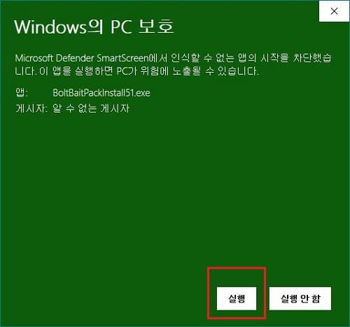 'BoltBaitPack51.zip'이라는 파일을 다운로드하여 압축을 풀고 설치하면 됩니다. 혹시라도 윈도우 디펜더 스마트 스크린에서 설치 차단을 시도할 경우 추가 정보를 눌러 실행 버튼을 눌러주면 설치를 계속할 수 있습니다.