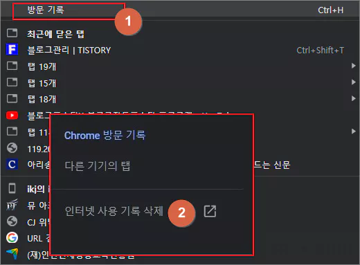 구글 크롬에서 방문 기록을 지우는 방법은 모두들 알고 계실 것입니다.