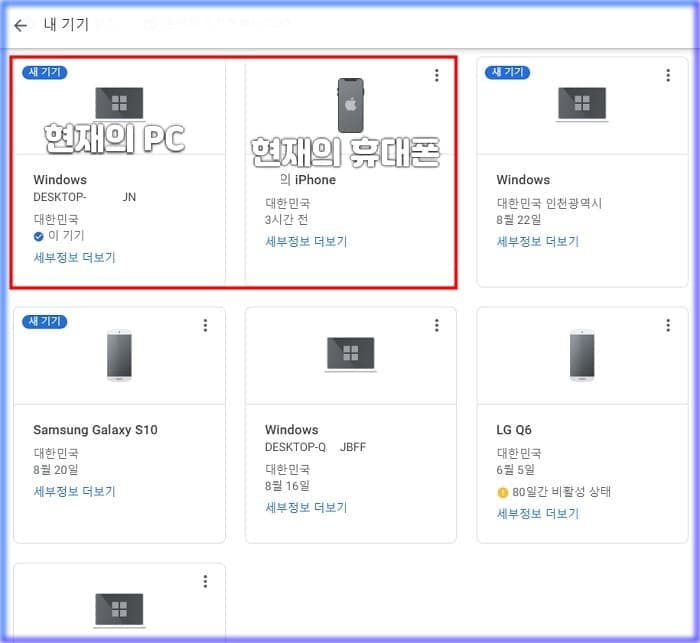 아래의 캡처 화면에서 보다시피 저도 예전에 쓰다 낡아져서 버린 PC나 휴대폰부터 모바일 게임을 위해 돌렸던 가상 모바일까지 다 나오더군요. 현재 사용하는 빨간색 사각형 안의 실제 기기 외에는 우측의 3점을 눌러 모두 로그 아웃시켰습니다.