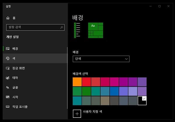 개인 설정에서 배경 색상을 아래와 같이 검은색에 체크해 두면 윈도우즈는 모든 기본 베이스 색상을 검은색을 기준으로 하게 됩니다.