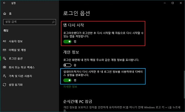 '엡데이트하거나 다시 시작한 후 내 로그인 정보를 사용하여 내 디바이스 설정을 완료합니다.' 위의 이미지에서 파란색 사각형의 옵션이며 윈도우즈 구버전에서는 이 기능이 위의 앱 다시 시작 기능을 함께 담당했던 것으로 추정됩니다.