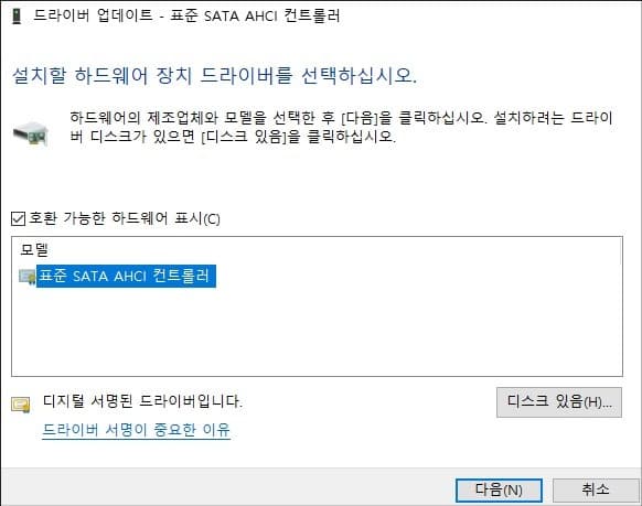 다음 화면에서 표준 SATA AHCI 컨트롤러를 선택하고 다음 버튼을 클릭합니다.