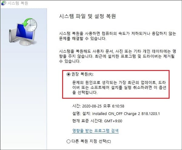 권장 복원 지점이 존재하면 해당 복원 지점을 클릭하고, 존재하지 않는 다면 다른 복원 지점이 있는지 살펴보고 적당한 복원 지점을 선택하여 복원 과정을 진행합니다.