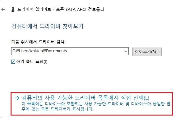 다음 화면에서 '컴퓨터의 사용 가능한 드라이버 목록에서 직접 선택'을 클릭합니다.