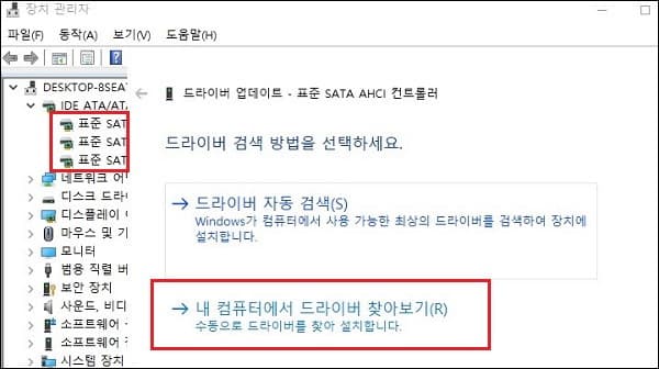 표준 SATA AHCI 컨트롤러를 우클릭하여 '드라이버 업데이트'를 클릭합니다.