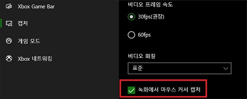 - 윈도우 설정 > 게임 > 캡처 > 녹화에서 마우스 커서 캡처