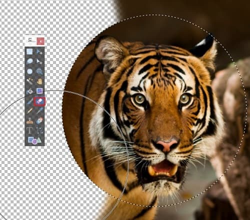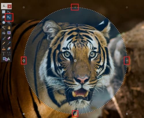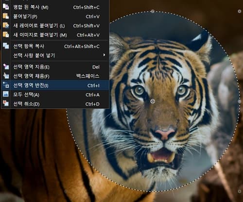 - 제가 따내고 싶은 부분은 호랑이의 얼굴이므로 원형 선택 툴을 사용하여 호랑이의 얼굴 부분만 적당한 크기로 선택합니다. 이때 좀 더 세밀한 선택을 하고 싶은 경우에는 왼쪽의 도구 바에서 위에서 두 번째에 있는 '선택 영역 이동'이라는 커서 모양을 클릭하면 원형 선택 부분의 각 꼭짓점 부분을 드래그하여 조절할 수 있습니다.