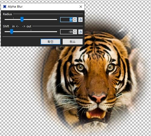 - Alpha Blur 옵션창에서 두 개의 옵션 슬라이더를 움직여 원하는 결과물에 가장 가까운 상태를 만듭니다.