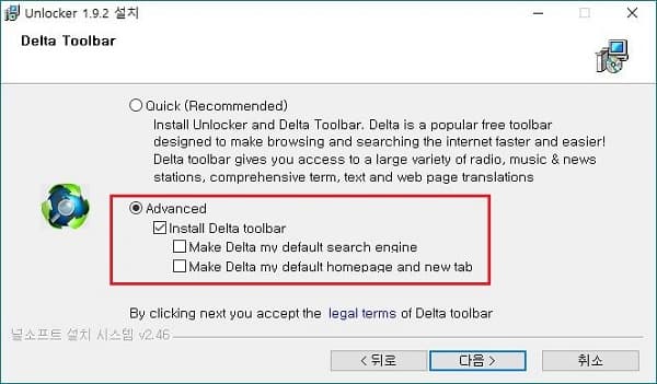 이 프로그램을 한글을 지원하며 설치도중 아래의 화면에서 반드시 고급을 선택한 다음 아래의 이미지처럼 체크 표시를 해주시기 바랍니다. 이렇게 하지 않으면 인터넷 홈페이지가 변경됩니다.