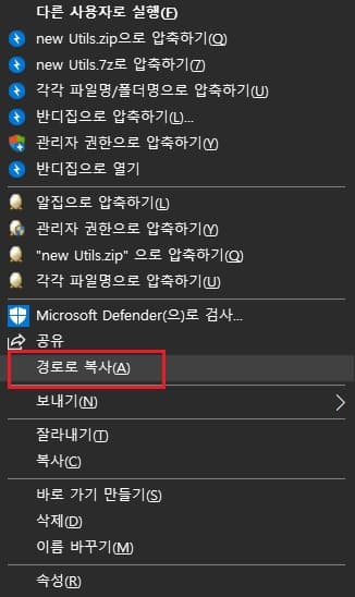 우클릭 메뉴에서 '경로로 복사'를 클릭합니다. 주의할 것은 우클릭할 때까지 시프트키를 떼면 안 됩니다. 시프트키를 떼면 '경로로 복사' 메뉴는 나타나지 않습니다.