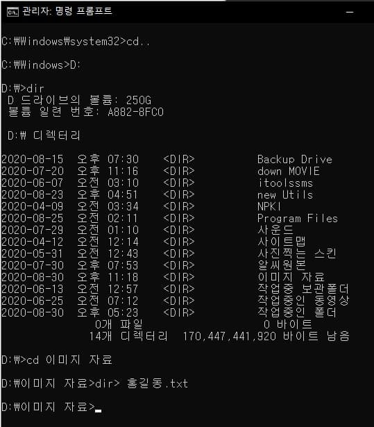 dir> 홍길동.txt 엔터 - 커서가 위치한 폴더내의 모든 파일 리스트를 홍길동.txt로 생성
