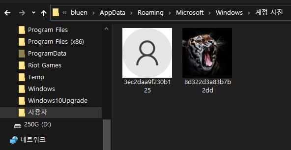 파일 탐색기에서 해당 위치로 들어가 보면 방금 생성한 프로필 사진이 이 폴더에 추가되어 있는 것을 확인 할 수 있습니다. 기본형만 오래도록 쓰다 최초로 변경했으니 2개가 있는 것이 보입니다. 설정에서도 2개가 보이고 있으며 이는 3개를 초과하지 않을 것입니다.