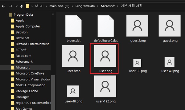 즉, 윈도우 설정에서 프로필 사진 바꾸기를 할 때 아래의 이미지에서와 같은 경로를 지정해 준다음 user.png라는 기본 이미지를 선택해 주시면 됩니다.