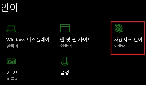 - 언어 설정창 우측의 항목 페이지에서 가장 상단의 아이콘 중 '사용지역 언어'를 클릭합니다.