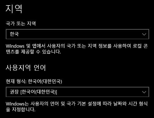 국가 또는 지역은 한국으로, 사용지역 언어는 '권장 [한국어(대한민국)]'으로 표시되게 설정하시기 바랍니다.