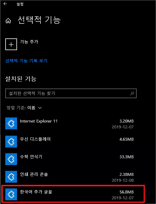 특히, 윈도우 시스템 폰트 등이 깨지는 현상이 발생하는 경우에는 반드시 살펴 보아야 할 부분으로 선택적 기능 영역에서 설치된 기능 부분에 한국어 추가 글꼴 목록이 보이지 않는 다면 반드시 위쪽의 기능 추가 버튼을 눌러 설치해 주어야 합니다.