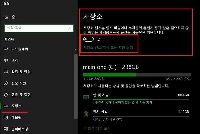 저장 공간 센스의 설정 위치는 윈도우즈 '설정 > 시스템 > 저장소'입니다.