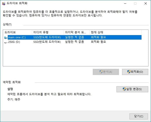 이전 버전의 윈도우에서 디스크 조각 모음이라고 불리던 기능입니다. 단편화된 파일 조각들을 재정렬을 통해 효율적으로 배치하여 공간의 낭비를 줄이고 하드 디스크의 입출력 속도를 개선하는 효과가 있습니다. 휴지통의 파일이나 현재 실행 중인 프로그램의 파일은 최적화하지 않습니다.