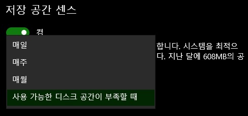 세부 설정 페이지에서 '사용 가능한 디스크 공간이 부족할 때'로 기본 옵션으로 맞추어 두면 윈도우에서 자동으로 공간이 부족해졌다고 판단하면 저장소 센스를 실행하게 됩니다. 드롭 다운 메뉴를 클릭하면 수동으로 매일, 매주, 매월로 설정해 실행 시기를 지정할 수도 있습니다.