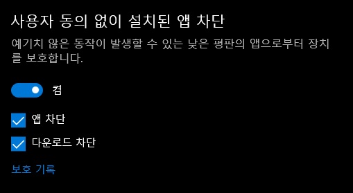 여기에서 "사용자 동의 없이 설치된 앱 차단" 항목을 꺼두시면 됩니다.